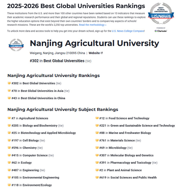 U.S. News & World Report(美国新闻与世界报道)2025—2026年全球最佳大学排名302名